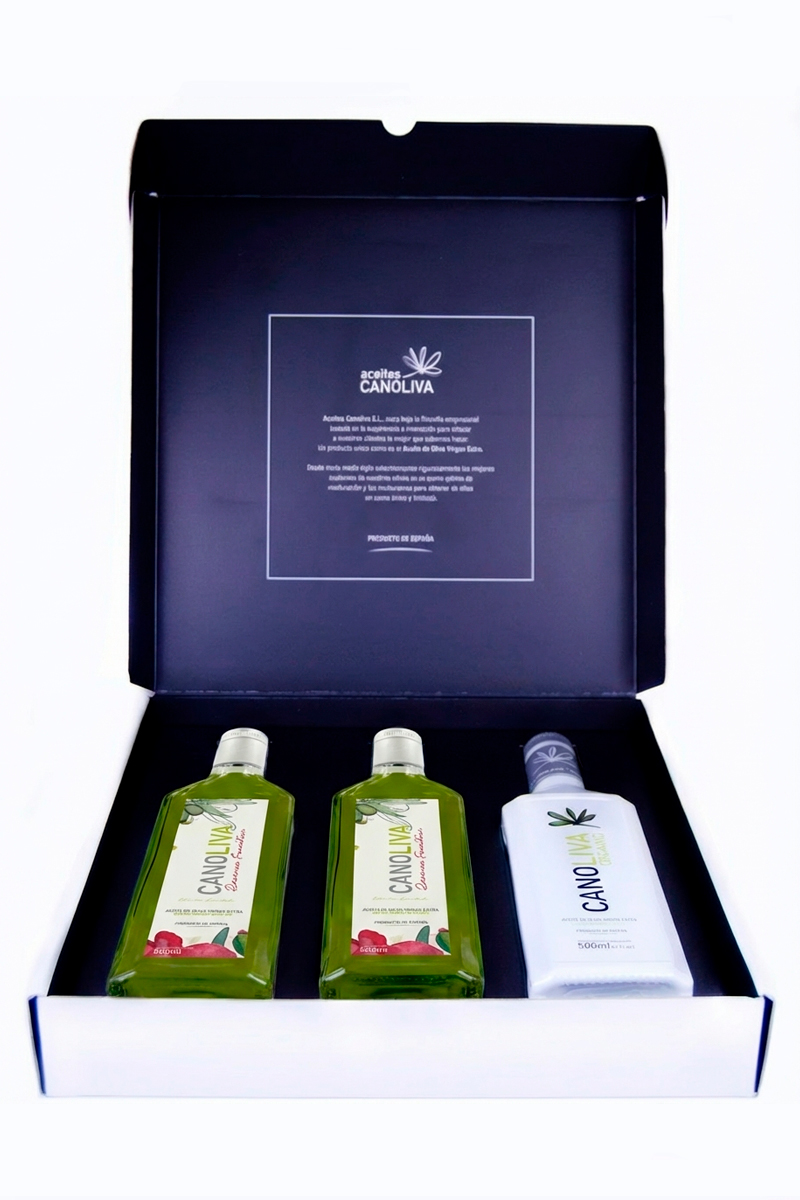 Un regalo perfecto, con diseño exquisito y un producto único en su interior. Contiene tres botellas de aceite de oliva virgen extra cosecha familiar de 250ml.
